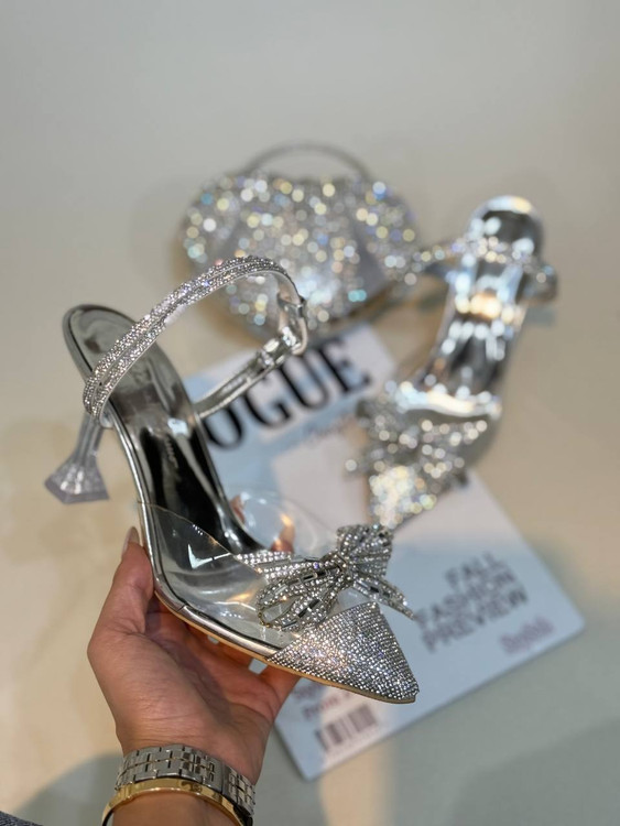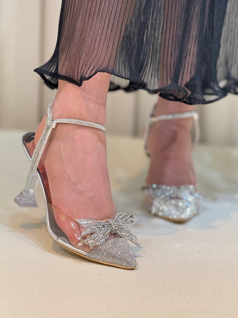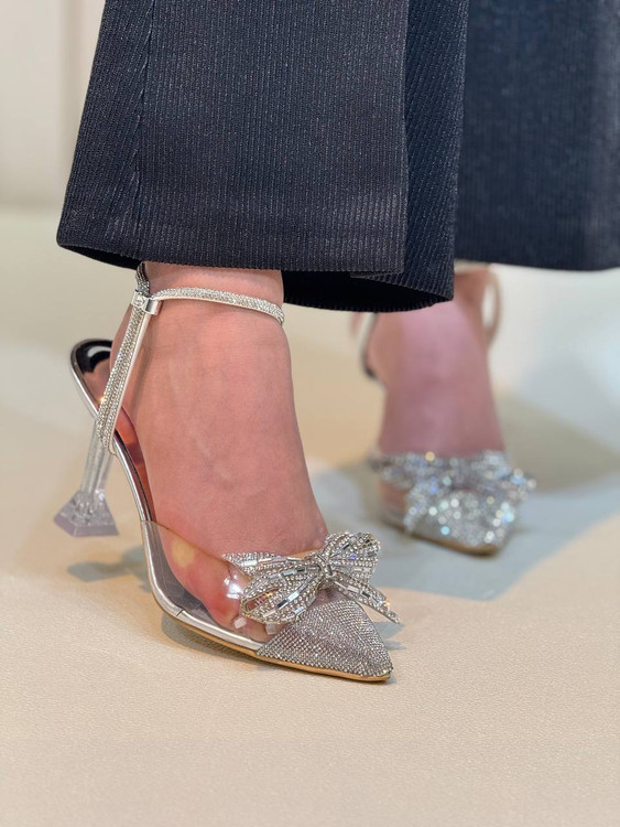 جنس: پاشنه کار 10 سانت جنس شیشه ای و رویه کار از جنس تلق صنعتی که بسیار نرم و انعطاف پذیر می باشد و یک پاپیون نگین دار رویه کار نصب شده