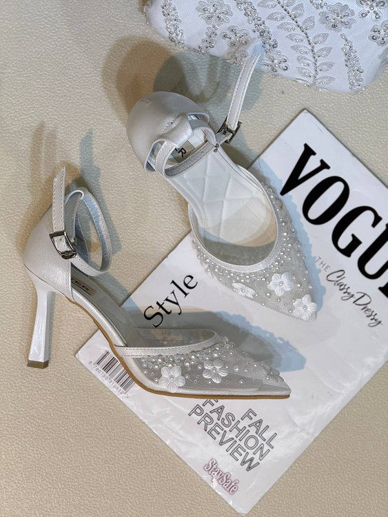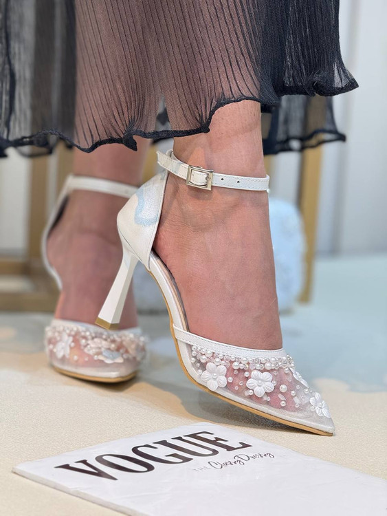 پاشنه 10 سانت رویه تور ساده و رح گل دوخت شده و نگین مرواریدی دوخت شده