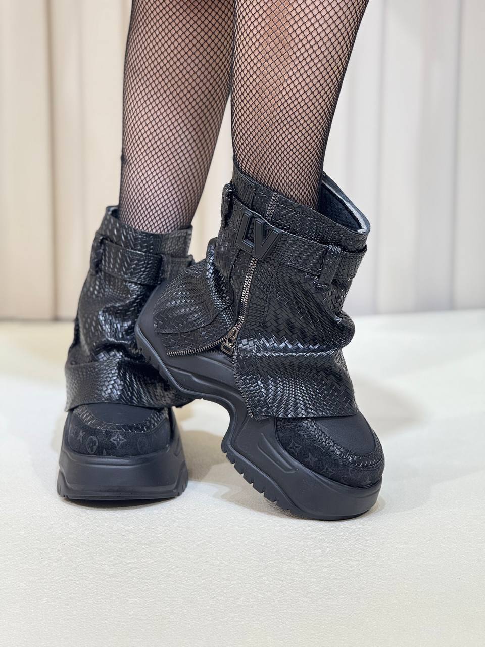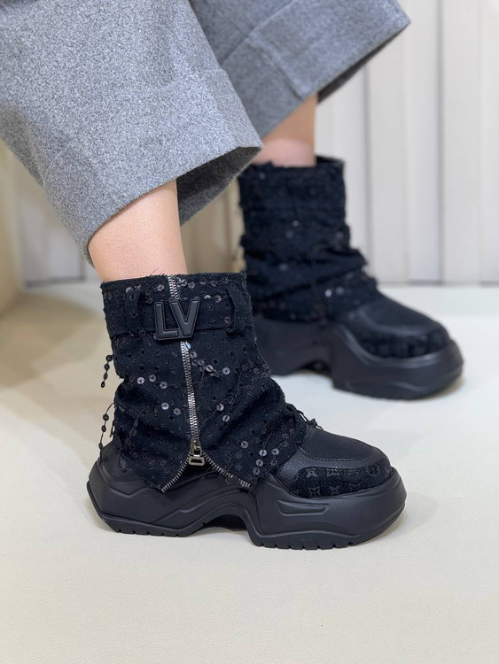 جنس: قد این نیم بوت 15 سانت و ارتفاع لژ 5 الی 7 سانت می باشد پاخور کار جورابی (بدون زیپ ) طوری طراحی شده که به صورت خیلی راحت پرو می شود و جنس رویه کار ترکیب پولک وپارچه اصلی لوی ویتون می باشد