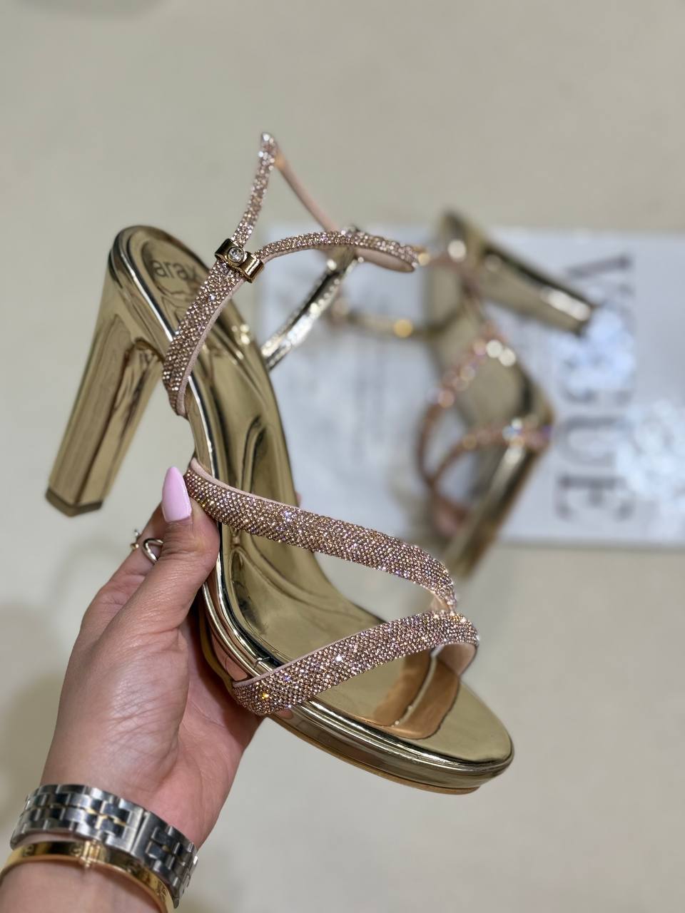 جنس: جنس رویه کار تی پیو براق و جنس رویه نگین کوب پرسی ضد ریزش پاشنه 10 سانت دو لژ فوق العاده راحت دور مچ سوارسکی نگین قابل تغییر به هر مچی