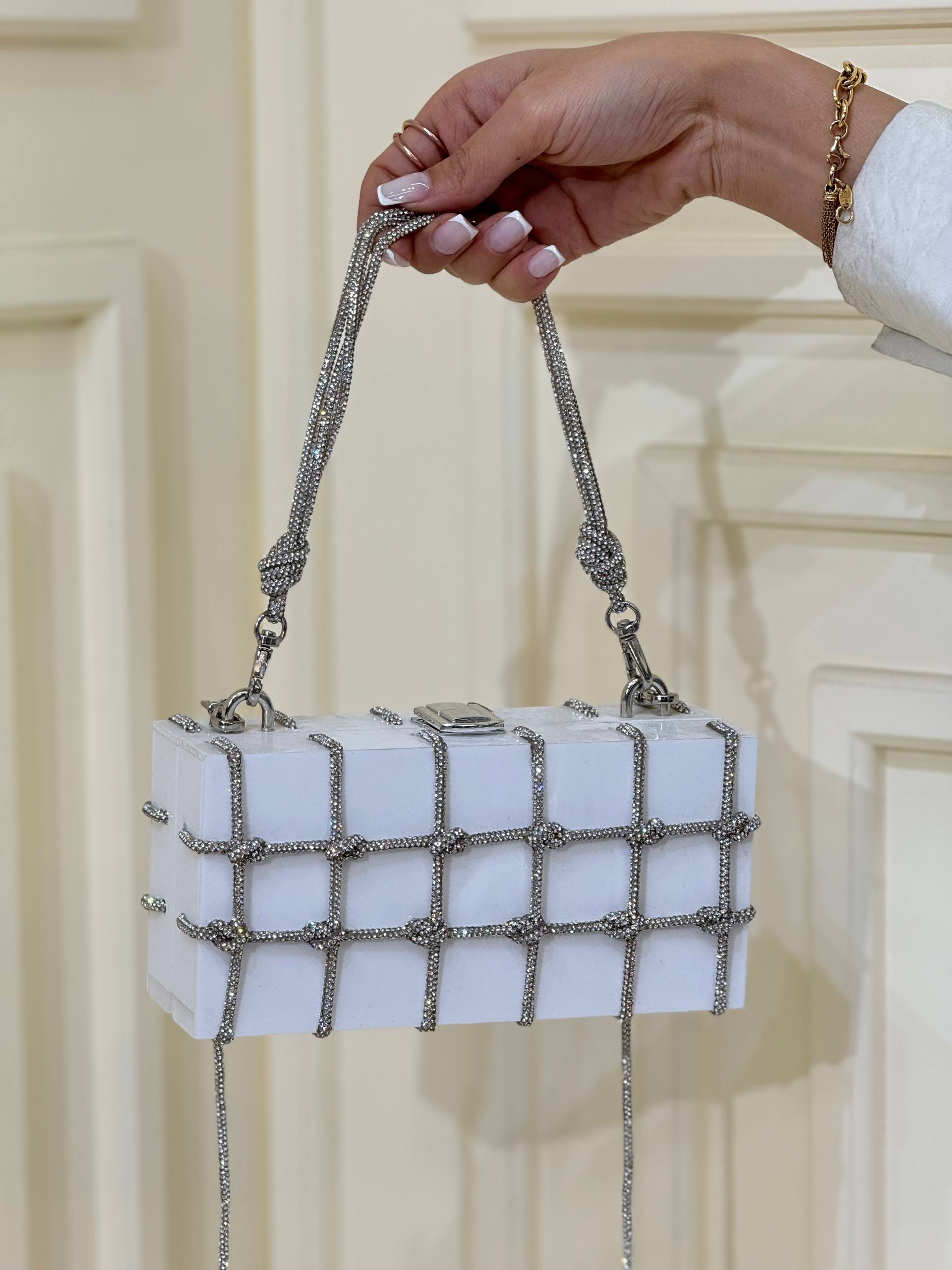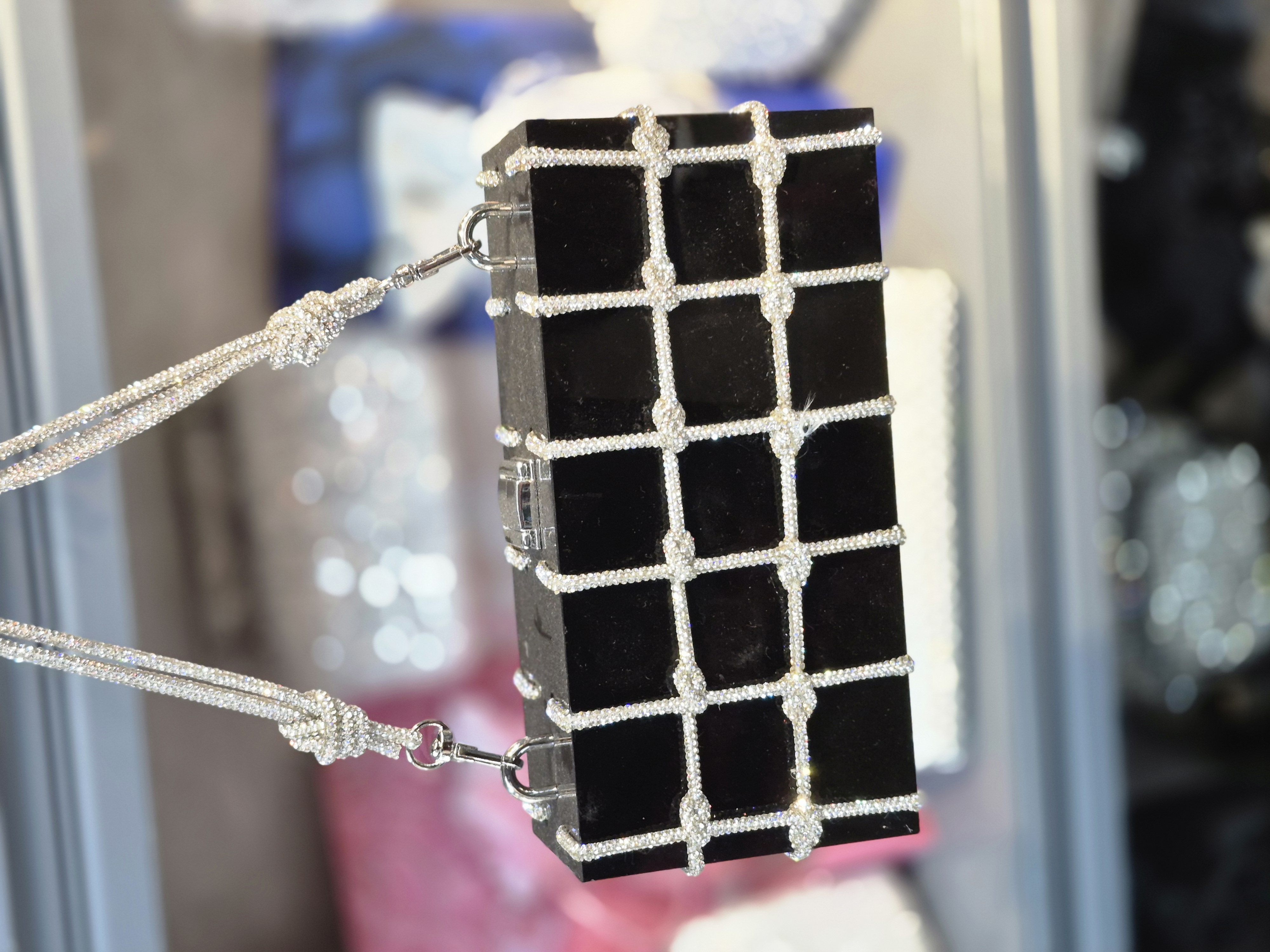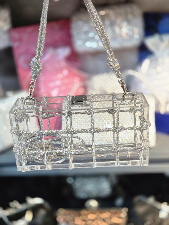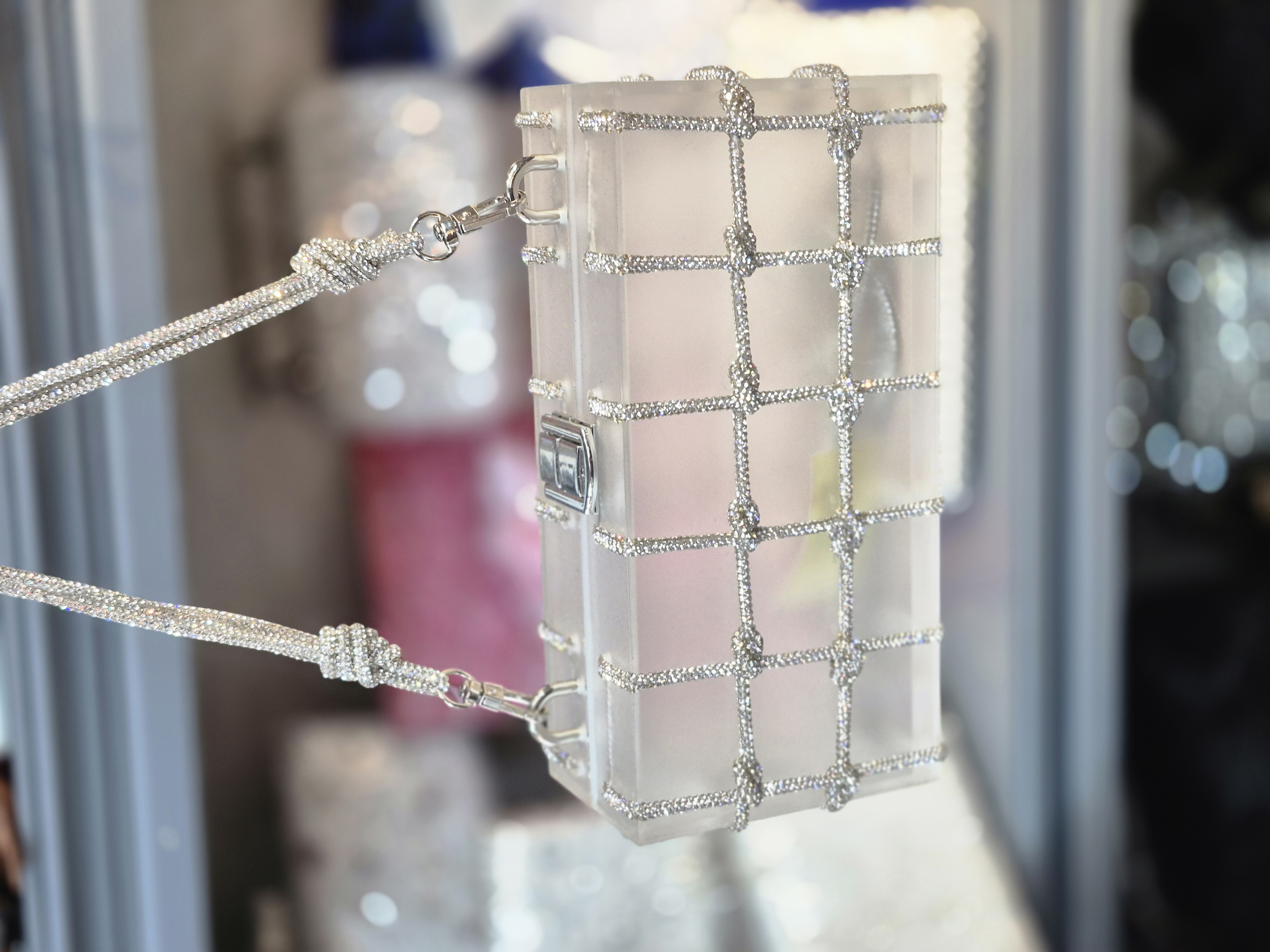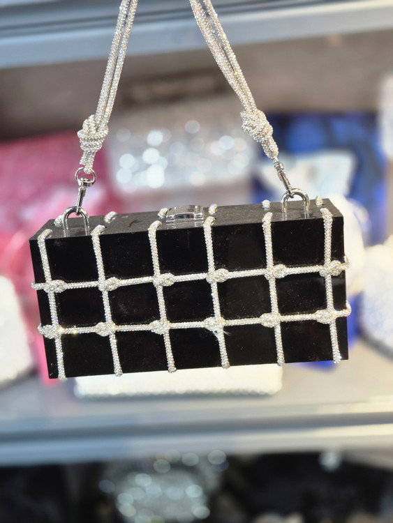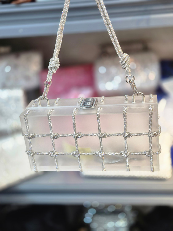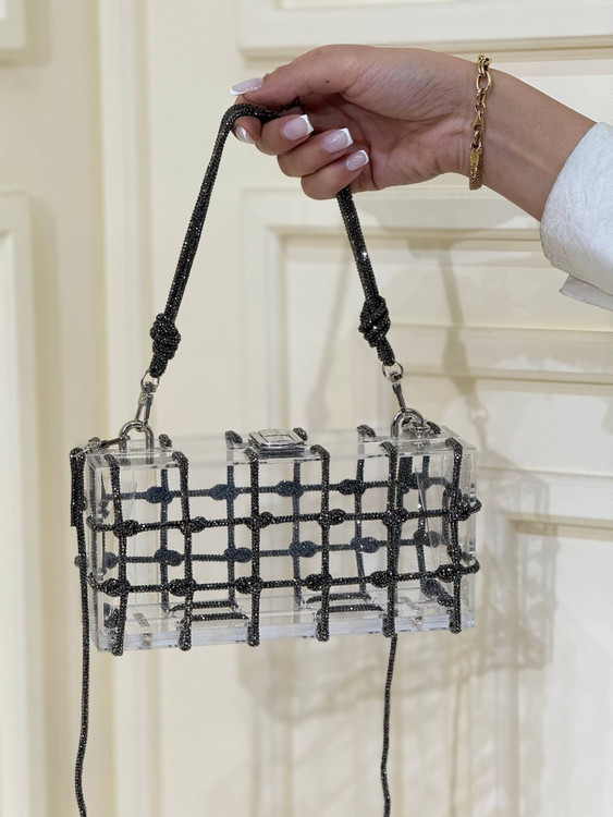 جنس: ابعاد 19 در 9 سانت .جنس رویه طلق صعنتی مات و شفاف . بند نگین سوارسکی پیچ شده . دارای دو بند یکی کوتاه برای حالت مچی دومی بلند برای حالت دوشی