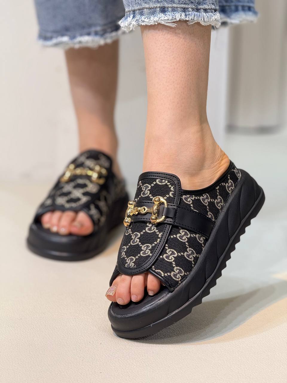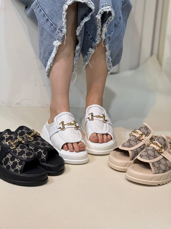 صندل گوچی جلو باز با لژ 5سانت و زیره پیو بسیار سبک و راحت و رویه پارچه طرح اصلی گوچی